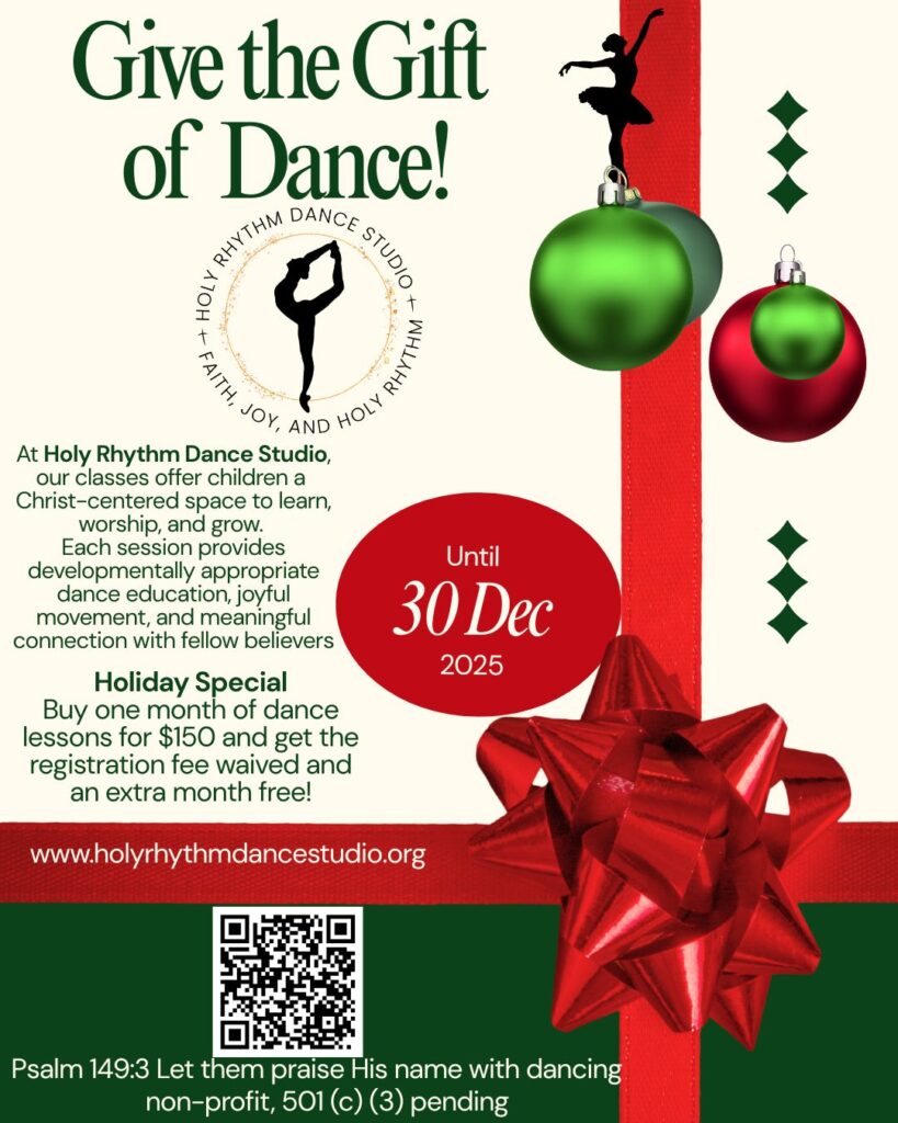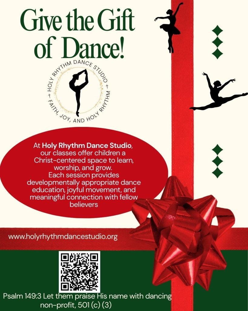 Holy Rhythm Dance Studio offers a joyful, Christ-centered environment where children can learn, worship, and grow. Each session includes developmentally appropriate instruction, expressive and fun movement, and meaningful fellowship with other believers. Our dancers are encouraged to use their God-given gifts—and their developing technique—to worship the Lord through dance, embracing His faith, joy, and holy rhythm. Thank you for helping us continue this mission.