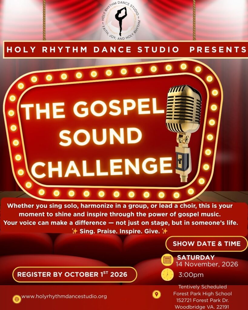 Join us for The Gospel Sound Challenge—a dynamic audition event celebrating faith, unity, and powerful musical talent. Taking place on November 14, 2026 at 3 PM, this showcase invites aspiring gospel vocalists to step onto one stage and create one unforgettable sound. Hosted at 15721 Forest Park Drive, Woodbridge, VA 22191, the event captures the spirit of worship and community, bringing voices together in a vibrant atmosphere. Register by October 1 to be part of this inspiring experience and share your gift with a live audience.